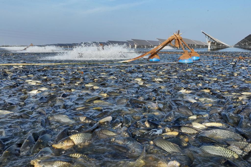 這是河北省唐山市豐南區(qū)黑沿子鎮(zhèn)“漁光一體”現(xiàn)代漁業(yè)產業(yè)園魚塘內場景(無人機照片)。新華社記者 楊世堯 攝