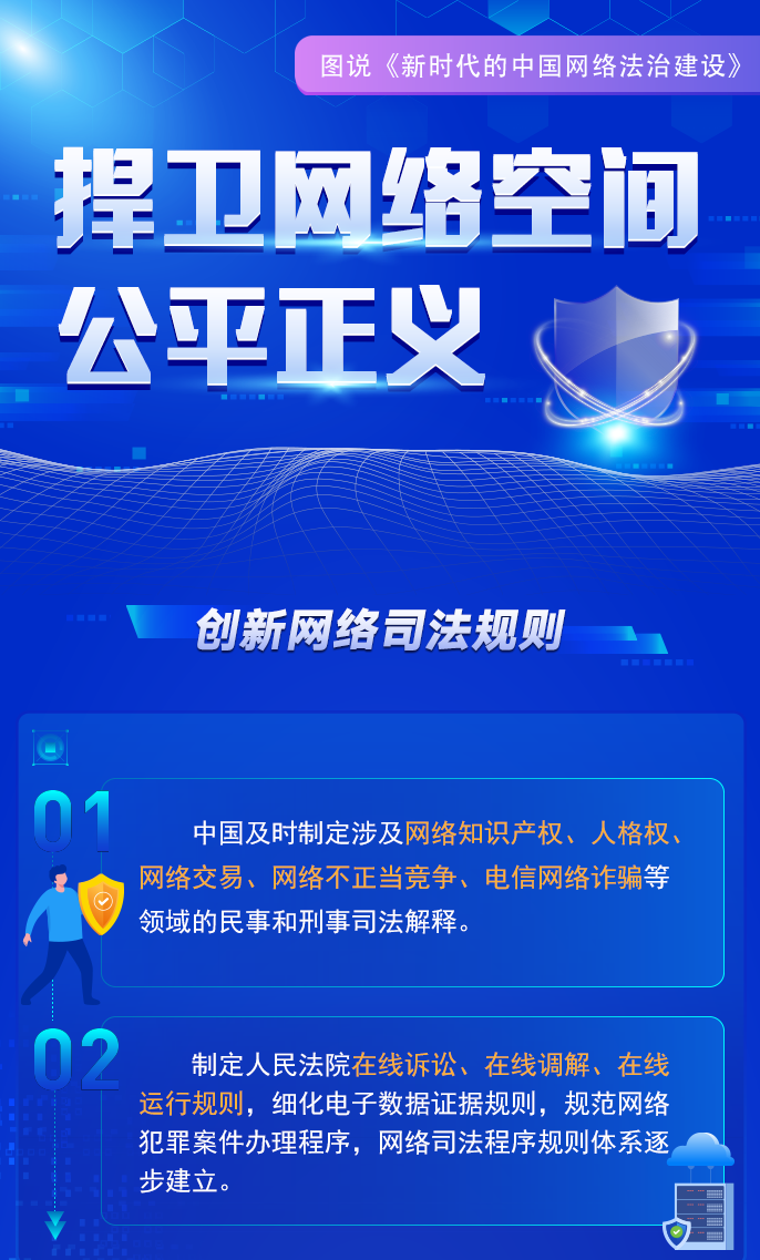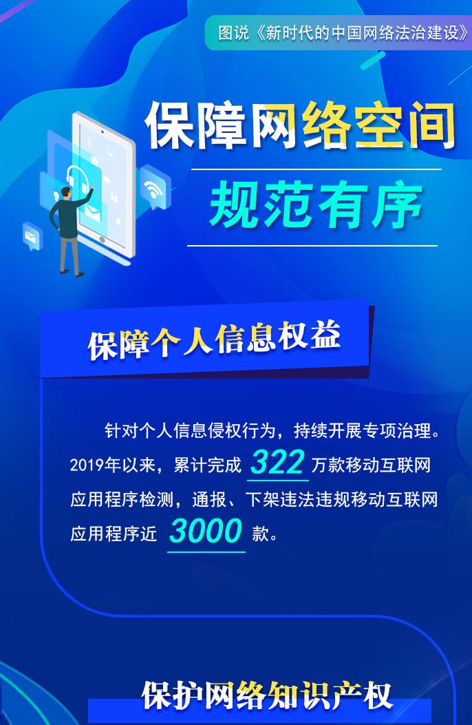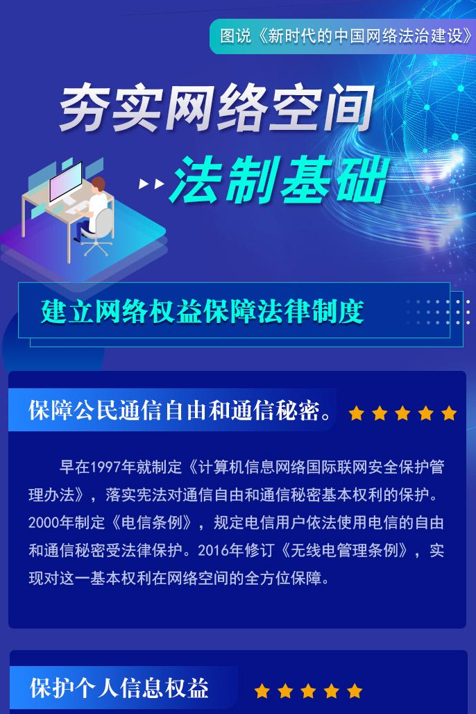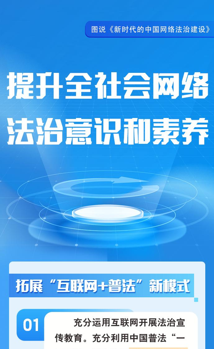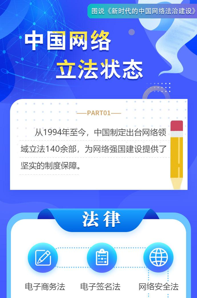 自1994年全功能接入國際互聯(lián)網(wǎng)以來,中國堅持依法治網(wǎng),持續(xù)推進網(wǎng)絡(luò)空間法治化,推動互聯(lián)網(wǎng)在法治軌道上健康運行。進入新時代,在習(xí)近平新時代中國特色社會主義思想指引下,中國將依法治網(wǎng)作為全面依法治國和網(wǎng)絡(luò)強國建設(shè)重要內(nèi)容,努力構(gòu)建完備的網(wǎng)絡(luò)法律規(guī)范體系、高效的網(wǎng)絡(luò)法治實施體系、嚴密的網(wǎng)絡(luò)法治監(jiān)督體系、有力的網(wǎng)絡(luò)法治保障體系,網(wǎng)絡(luò)法治建設(shè)取得歷史性成就。