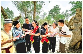 圖為新疆維吾爾自治區(qū)阿瓦提縣人民法院旅游巡回法庭的法官在該縣刀郎部落景區(qū)向游客和景區(qū)服務(wù)商家開(kāi)展普法宣傳。