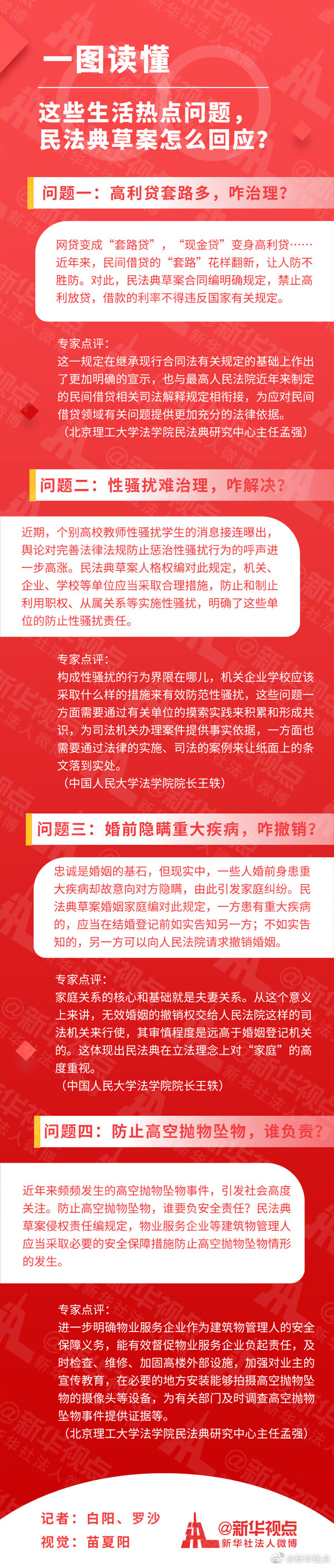 由民法典各分編草案與民法總則“合體”而成的民法典草案,23日于十三屆全國人大常委會第十五次會議上亮相。明確禁止高利放貸、完善防止性騷擾有關(guān)規(guī)定、合理確定無效婚姻的情形、完善高空拋物墜物責任規(guī)則......這些生活中的熱點問題,民法典草案都予以明確回應(yīng)。