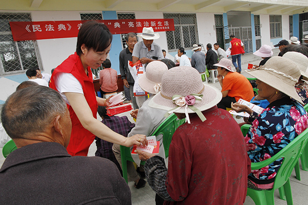 圖為律師和志愿者正在向村民們宣講民法典相關內容。