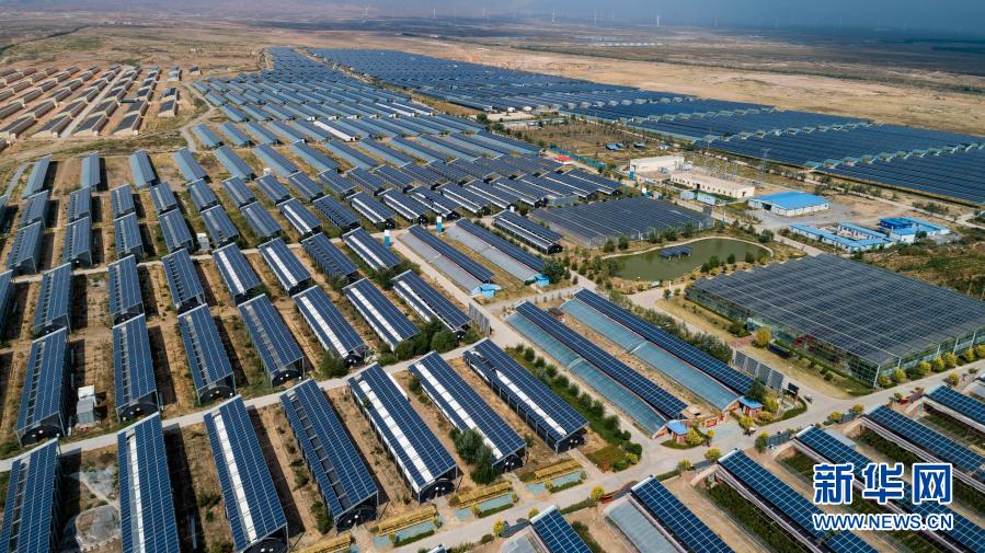 俯瞰寧夏銀川市永寧縣閩寧鎮(zhèn)原隆村的光伏大棚(無人機(jī)照片,2019年9月3日攝)。新華社記者 王鵬 攝
