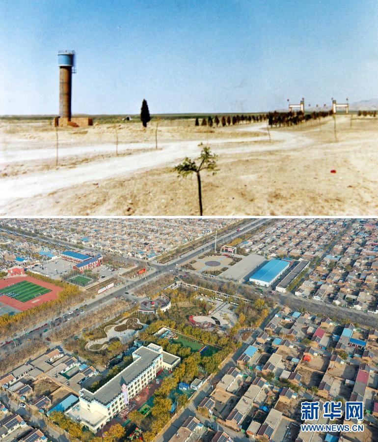 這是一張拼版照片。上圖為寧夏銀川市永寧縣閩寧鎮(zhèn)建設(shè)初期景象(資料照片);下圖為2020年11月11日拍攝的寧夏銀川市永寧縣閩寧鎮(zhèn)原隆村(無人機(jī)照片,新華社記者馮開華攝)。新華社發(fā)