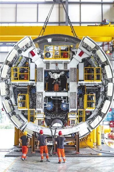 廣東省佛山市順德區(qū),在中鐵華隧聯(lián)合重型裝備有限公司生產(chǎn)車間內(nèi),工人正在組裝盾構(gòu)主機(jī)。