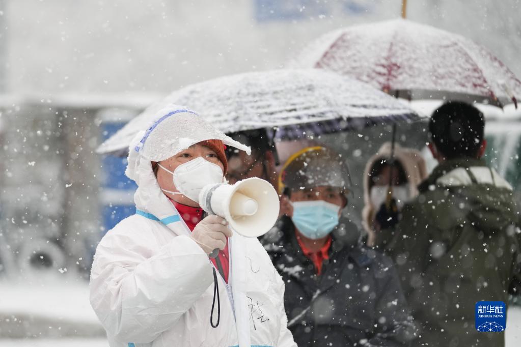 3月18日,在北京市東城區(qū)北新橋街道一處核酸采樣點(diǎn),工作人員冒雪引導(dǎo)前來(lái)檢測(cè)的居民。新華社記者 鞠煥宗 攝
