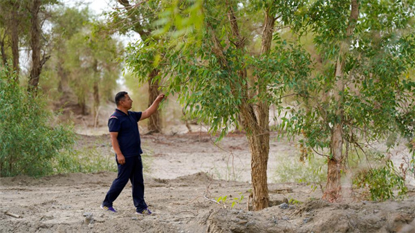 6月20日,艾力·尼亞孜在塔里木河支流查看胡楊生長情況。