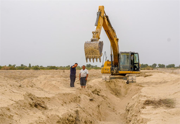 6月20日,艾力·尼亞孜(左)查看托布協(xié)區(qū)域引洪灌溉情況。